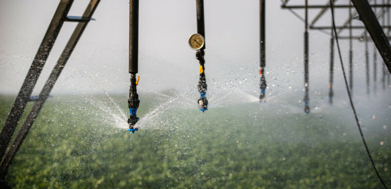 Once we determine water needs for each field and crop, we can prescribe an exact watering schedule that will be applied by irrigation systems. We use center-pivot irrigators for efficient and even water application, which are equipped with drop-down nozzles to keep the water close to the soil and reduce water lost to evaporation.